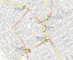 58, 72, 87 und 91) und in der Rheinstraße nahe der Darmstädter Straße (Linien 58 und 91) eingerichtet.