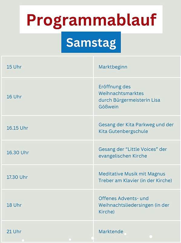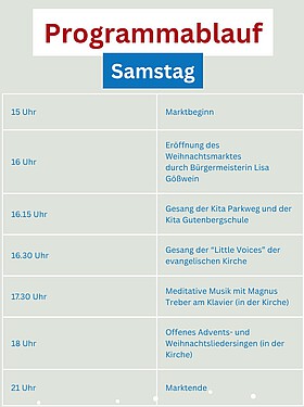 An beiden Tagen wird auf dem Weihnachtsmarkt ein musikalisches Programm zu hören sein. Ganz besonders sei auf das offene Advents- und Weihnachtsliedersingen hingewiesen, das am Samstag, um 18 Uhr, in der evangelischen Kirche zum Mitsingen einlädt. Am Sonntag, um 11 Uhr, findet ein Gottesdienst zum Advent in der Kirche statt.