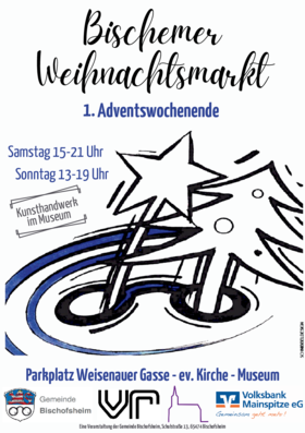 Der stimmungsvolle Bischofsheimer Weihnachtsmarkt findet immer am ersten Adventswochenende statt. Am Samstag, 29.11. und Sonntag, 30.11. werden 19 Stände und ein Kinderkarussell rund um die evangelische Kirche zu finden sein. Nicht nur die Weisenauer Gasse und der angrenzende Parkplatz bieten dann eine weihnachtliche Kulisse. Das nahegelegene Heimatmuseum öffnet ebenfalls seine Türen. Dort laden sieben Stände mit weihnachtlichem Kunsthandwerk zum Stöbern ein.
