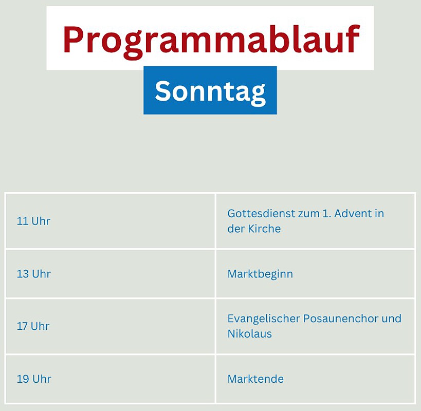 Am Sonntag findet um 11 Uhr ein Gottesdienst in der evangelischen Kirche statt. Um 13 Uhr öffnet der Weihnachtsmarkt. Um 17 Uhr sind der Evangelische Posaunenchor und der Nikolaus auf dem Kirchenvorplatz zu hören und zu sehen. Um 19 Uhr endet der diesjährige Bischofsheimer Weihnachtsmarkt.