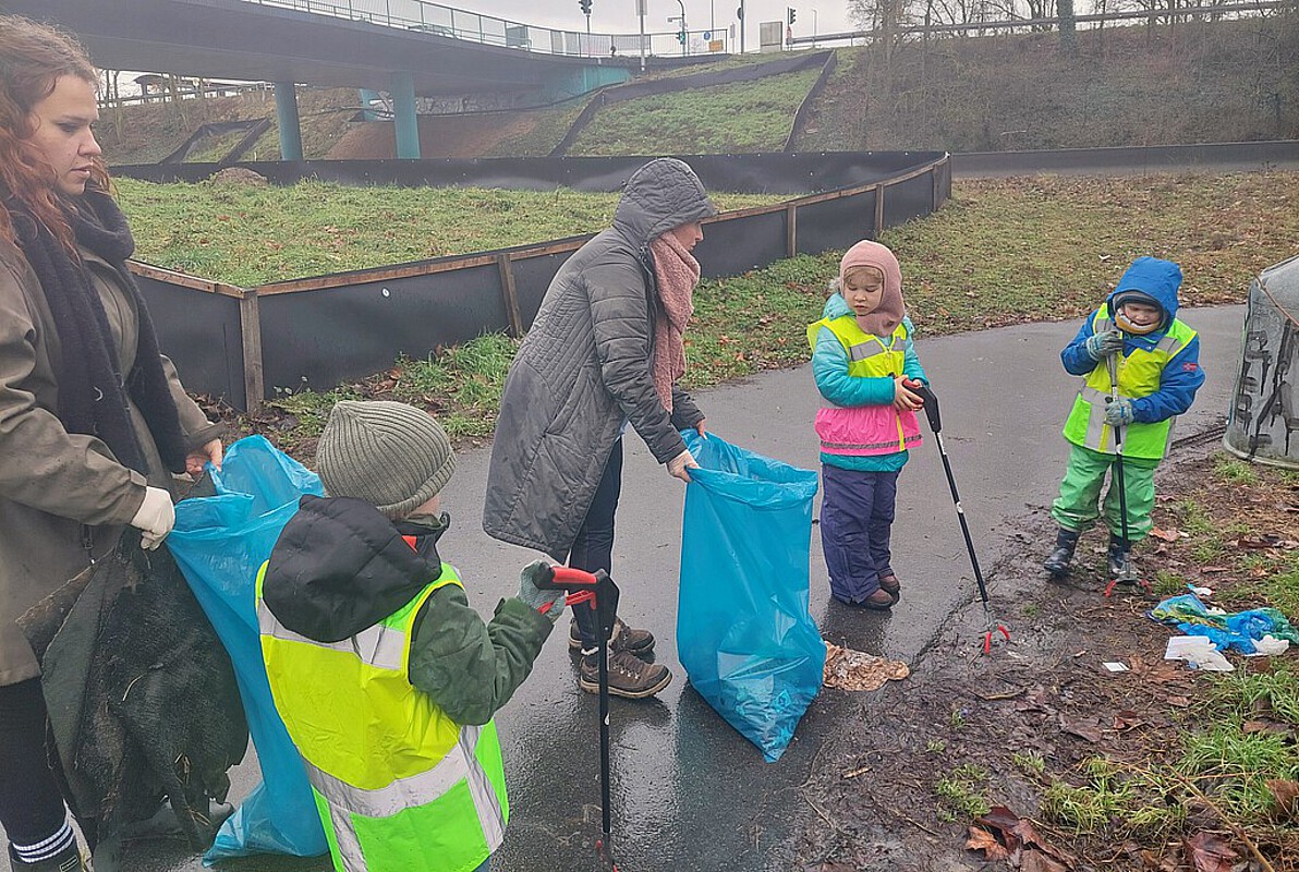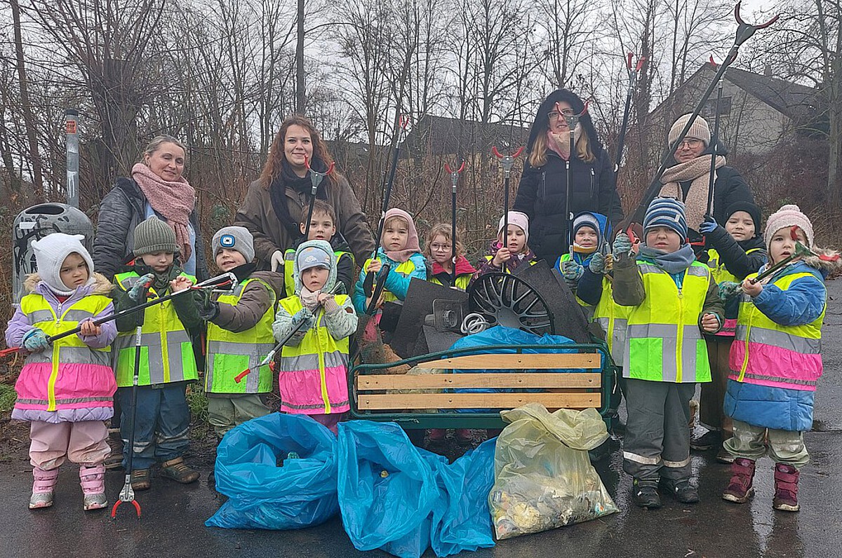 Kleine Müllsammler ganz groß! Kinder der Kita Birkenweg sammelten an zwei Vormittagen in der Böckler-Siedlung Abfall ein. Sie waren ganz professionell mit Warnwesten und kleinen Greifzangen, ausgeliehen vom Bauhof, ausgestattet. Bei 16 Kindern und vier begleitenden Erzieherinnen hatte der achtlos weggeworfene Müll am Wegesrand und den Grünanlagen keine Chance. Neben normalem Abfall fanden die Kleinen auch eine Felgenkappe und Teile einer Spülmaschine. Das Sammelgut wurde sofort vor Ort professionell getrennt. Es gab sowohl Mülltüten für Wertstoffe als auch Restmüll. „Wir hatten gerade das Thema Mülltrennung mit den Kindern besprochen, so dass sie die Theorie jetzt in die Tat umsetzen können“, erzählt eine der begleitenden Erziehrinnen, Evelina Schall.