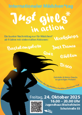 Anlässlich des Internationalen Mädchen*tags findet am 24. Oktober 2025, von 16 bis 20 Uhr, die Veranstaltung „Just girls* in action“ im Jugendhaus Bischofsheim, Schulstraße 55, statt. Die Einladung richtet sich an Mädchen* ab neun Jahren. Geboten wird ein vielfältiges Mitmachprogramm, das auch Tanz und Disco beinhaltet.